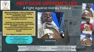 For years, Opeyemi has been battling a chronic kidney condition that has robbed him of his childhood. What should be days filled with school, play, and laughter are instead spent on hospital beds, hooked to dialysis machines.